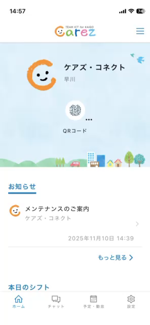 ケアズでは、画面にQRコードをかざすだけでタイムカードの打刻が可能です。