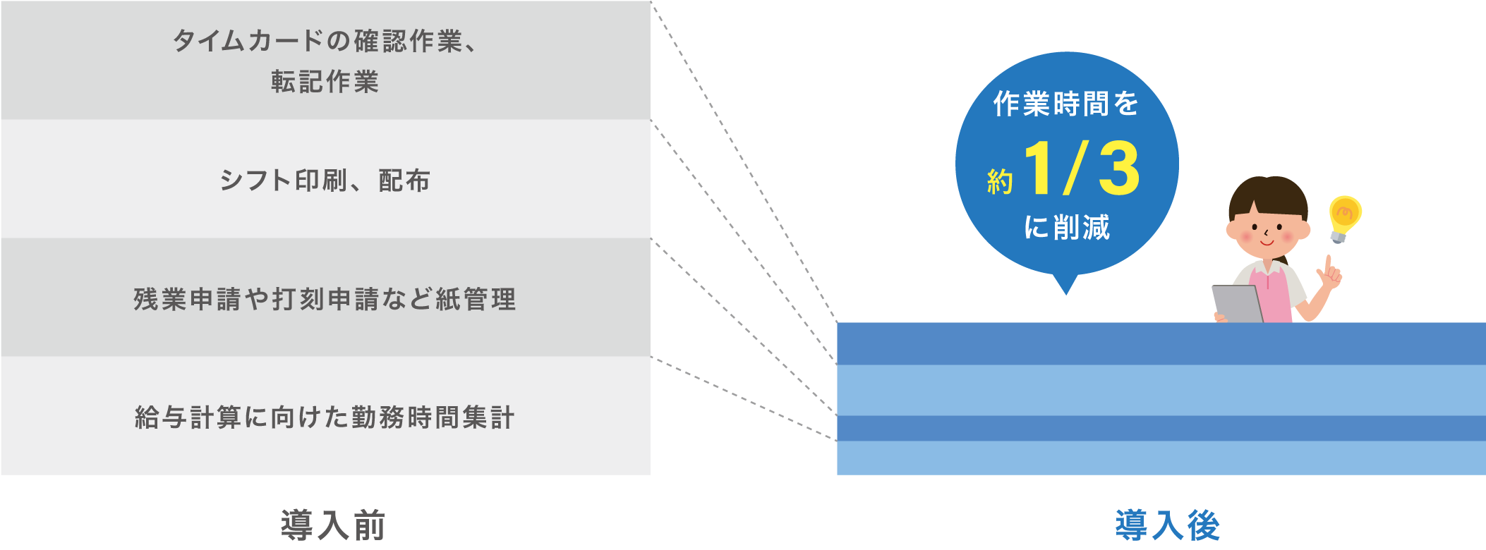 実績は打刻情報、残業申請を確認し、運営指導・加算取得申請で必要な勤務形態一覧がワンクリックで出力されます。