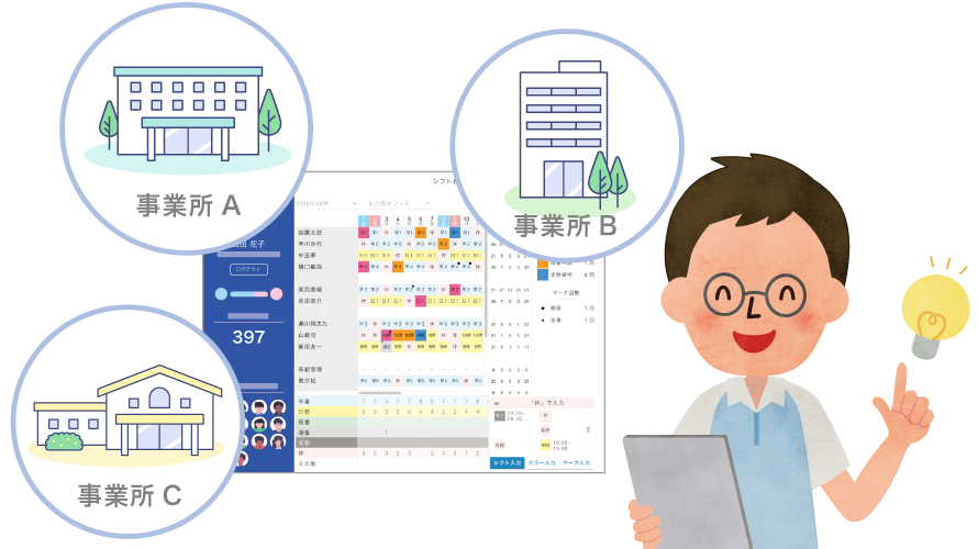 法人内で複数の事業所を兼務している職員のシフト作成もケアズならスムーズに行えます。