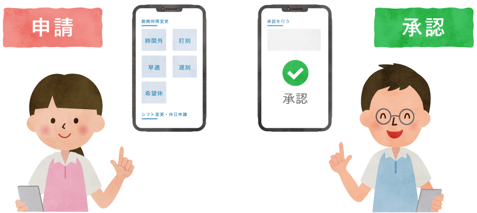 希望休・有給や残業などの勤怠に関する申請は、申請~承認までケアズで完結!申請書類の大幅削減につながります。